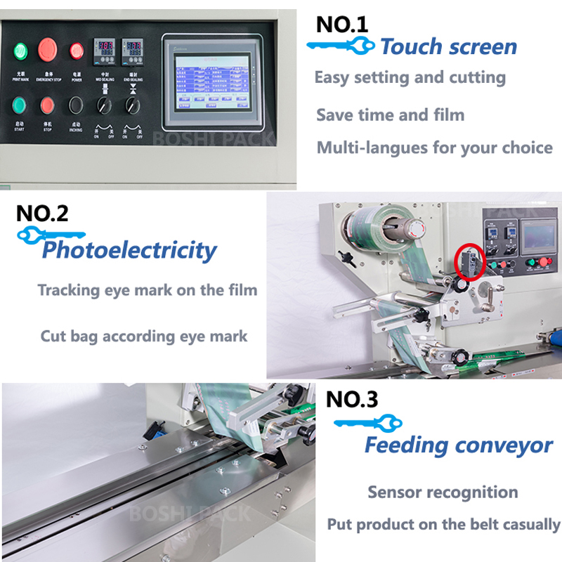 (Automatic pillow packing machine, suitable for bakery bread packing, chocolate bar packing, sausage packing, popsicle packing, hardware packing, and etc.)