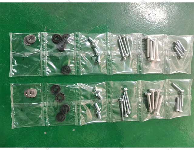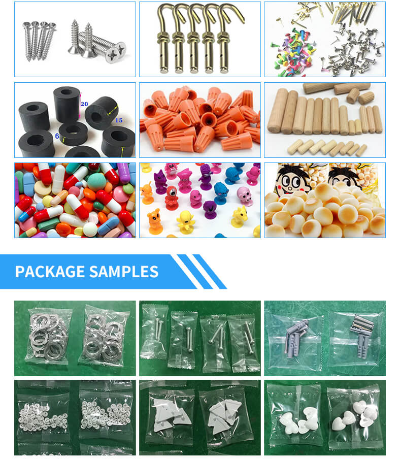 Bowl vibration counting and packing machine is suitable for hardware accessories, such as screws, nuts, washers; furniture accessories, such as wooden pins,self-tapping screws, wrenches; standard accessories, such as toys, food, medicine; lighting industry, such as: Hanging boards,wiring caps, expansion rubber, foot nails and other materials.